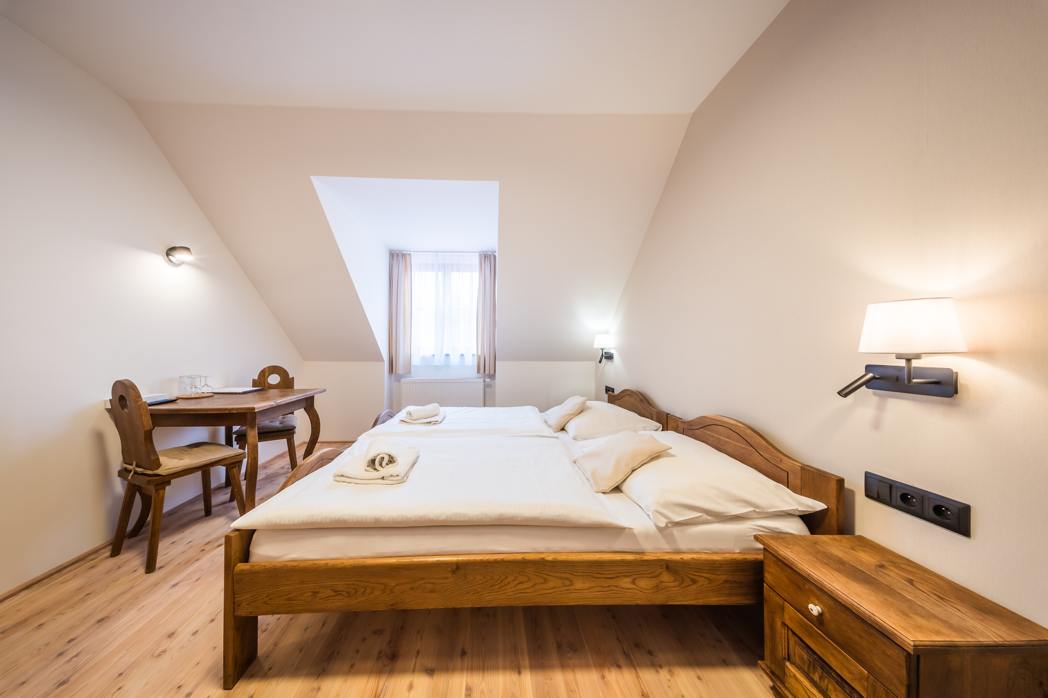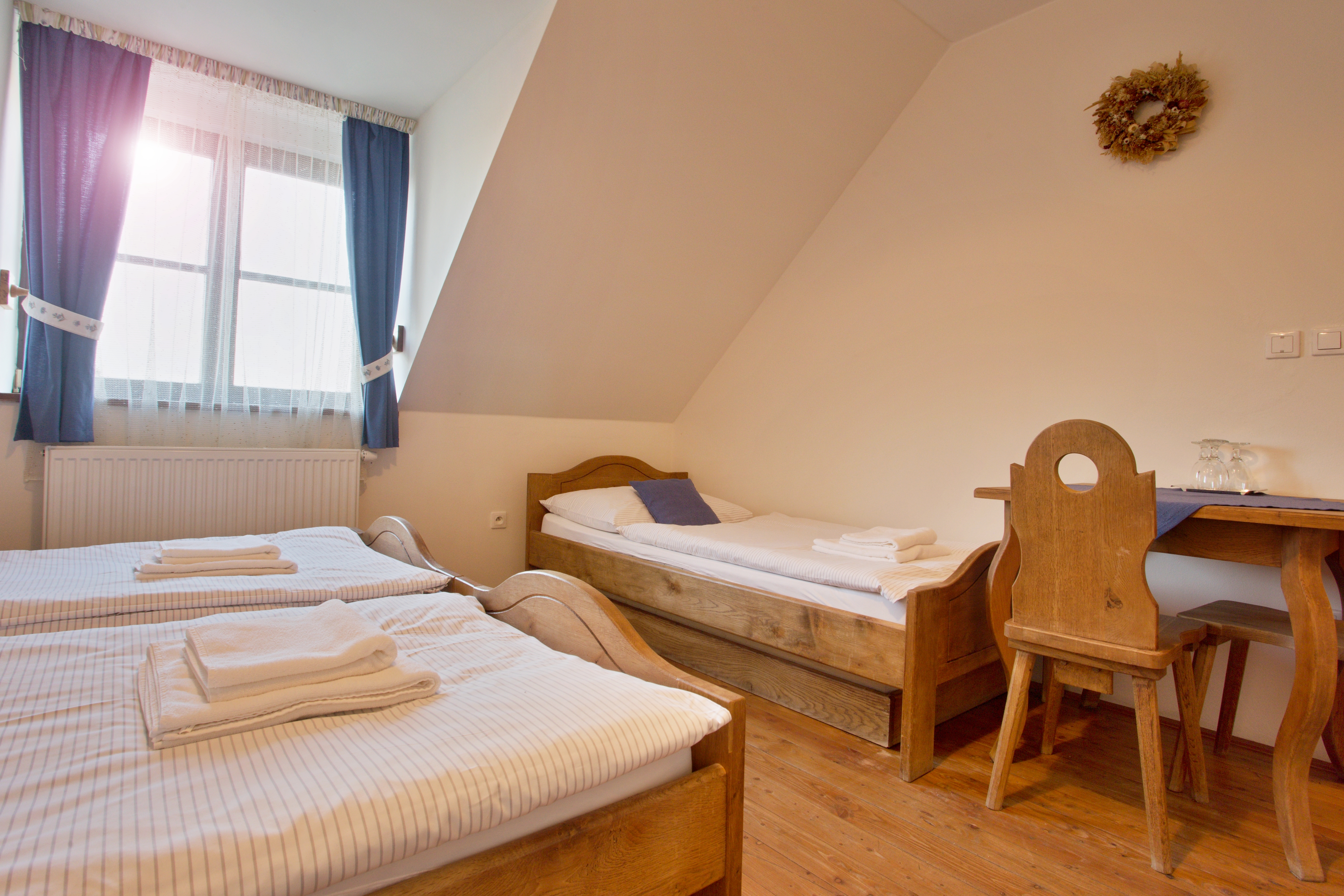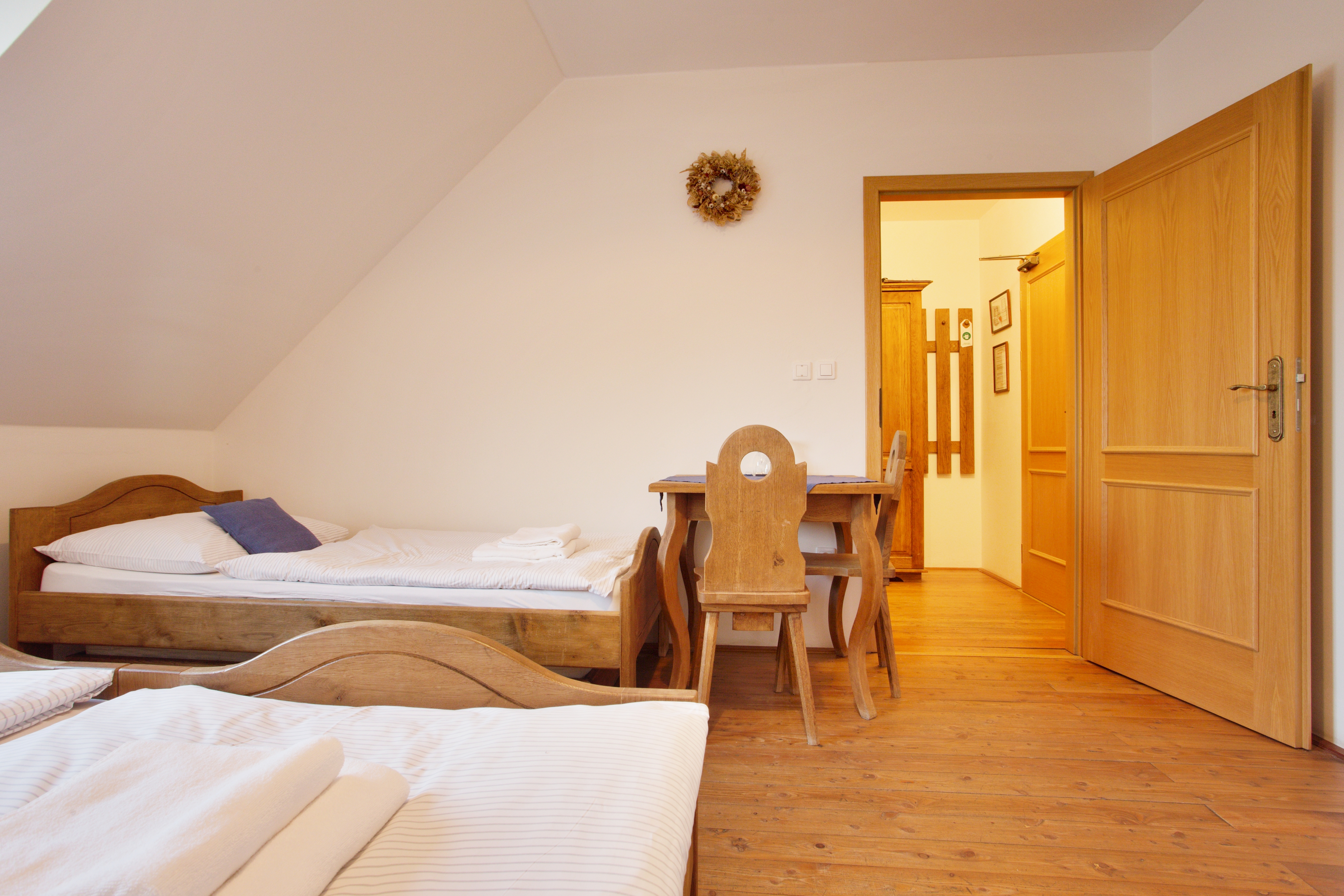 Our guests can enjoy well-equipped rooms (49 beds and 15 extra beds) of the *** category (certified by the Association of Hotels and Restaurants of the Czech Republic) furnished in a rustic-peasant style. The pleasant and cozy atmosphere is completed by solid oak furniture and plank floors.